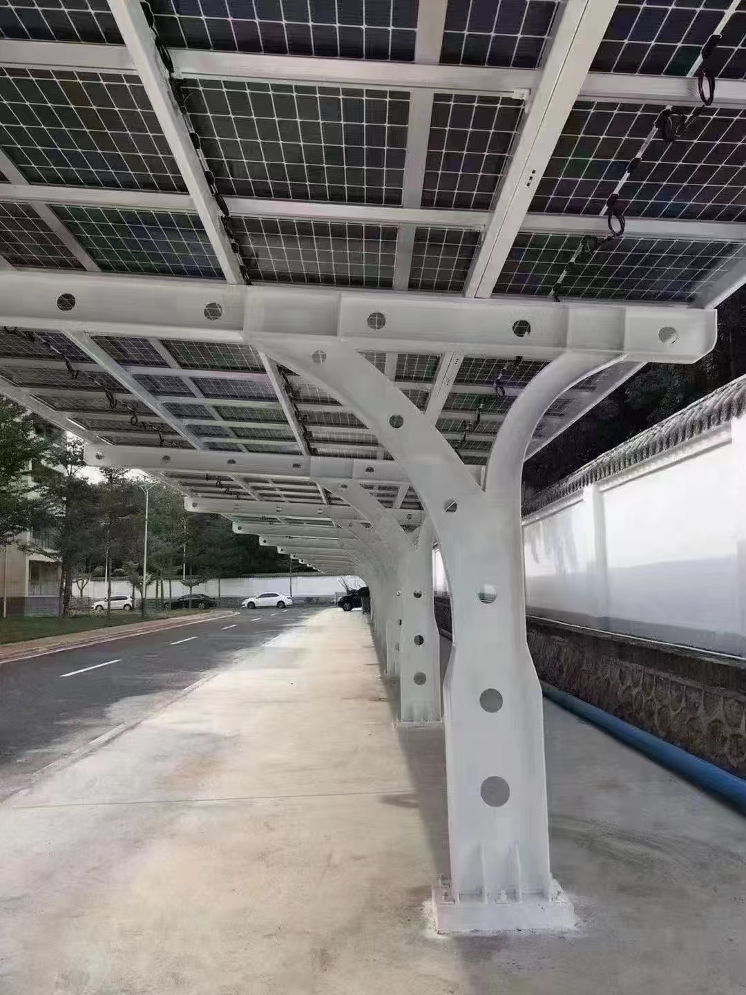 光伏车棚采用钢结构骨架 + 光伏组件一体化方案,兼顾遮阳避雨与发电收益。支持按图加工、定制尺寸、现场安装。